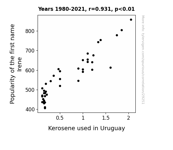 This means 86.7% of the change in the one variable (i.e., Kerosene used in Uruguay) is predictable based on the change in the other (i.e., Popularity of the first name Irene) over the 42 years from 1980 through 2021.