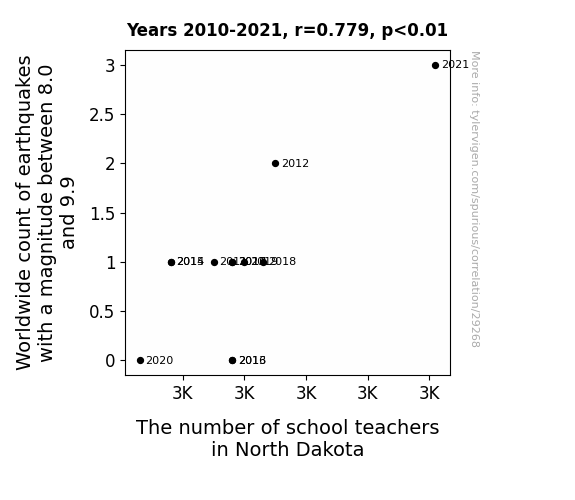 This means 60.7% of the change in the one variable (i.e., The number of school teachers in North Dakota) is predictable based on the change in the other (i.e., Worldwide count of earthquakes with a magnitude between 8.0 and 9.9) over the 12 years from 2010 through 2021.