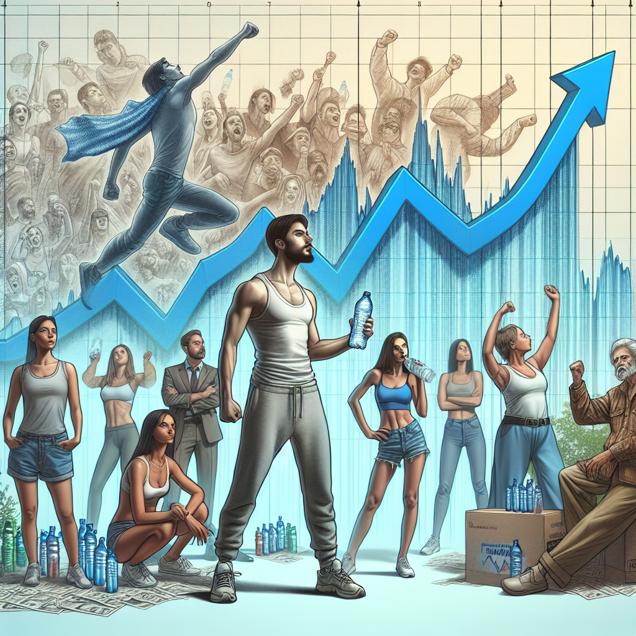 Prompt: Generate an image that is hyper-realistic, depicting a scene where a graph shows a rising line for US Bottled Water Consumption per Person. The graph is prominently displayed, with precise and detailed lines and data points. On the graph, there is an image of a person holding a bottle of water and looking inspired, with a sense of optimism and determination in their eyes. Adjacent to this, there is a financial chart displaying Pioneer Natural Resources Company's stock price (PXD) rapidly ascending. The stock chart is intricate, with realistic details and precise lines indicating the upward movement of the stock price. Additionally, people are depicted enthusiastically investing in the company, showcasing their excitement and confidence. The figures investing are realistic and detailed, capturing the fervor and activity of the investment scene. Ensure that both the water consumption graph and the stock price chart are portrayed with hyper-realistic precision, and the characters are depicted with authentic emotions, adding depth and vibrancy to the entire scene. The depiction should include only scenes, people, and objects, it should not include text or speech bubbles.