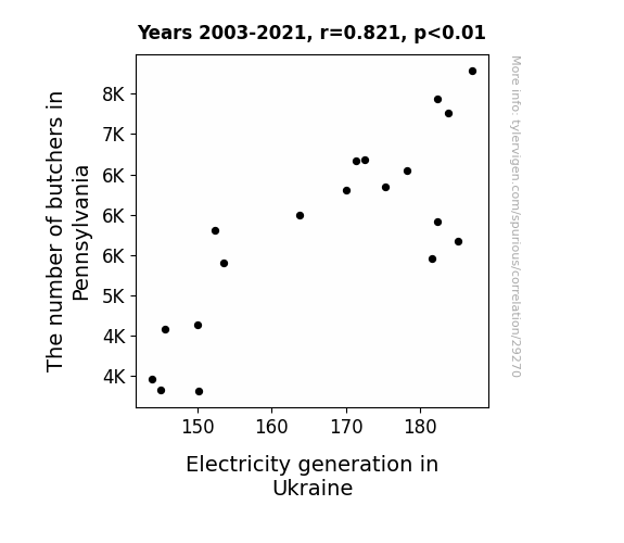 This means 67.5% of the change in the one variable (i.e., Electricity generation in Ukraine) is predictable based on the change in the other (i.e., The number of butchers in Pennsylvania) over the 19 years from 2003 through 2021.