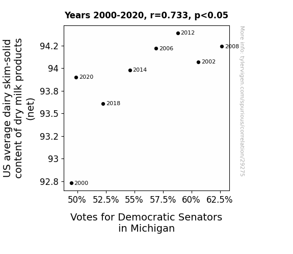 This means 53.8% of the change in the one variable (i.e., Votes for Democratic Senators in Michigan) is predictable based on the change in the other (i.e., US average dairy skim-solid content of dry milk products (net)) over the 8 years from 2000 through 2020.