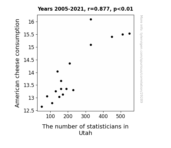 This means 77% of the change in the one variable (i.e., The number of statisticians in Utah) is predictable based on the change in the other (i.e., American cheese consumption) over the 17 years from 2005 through 2021.