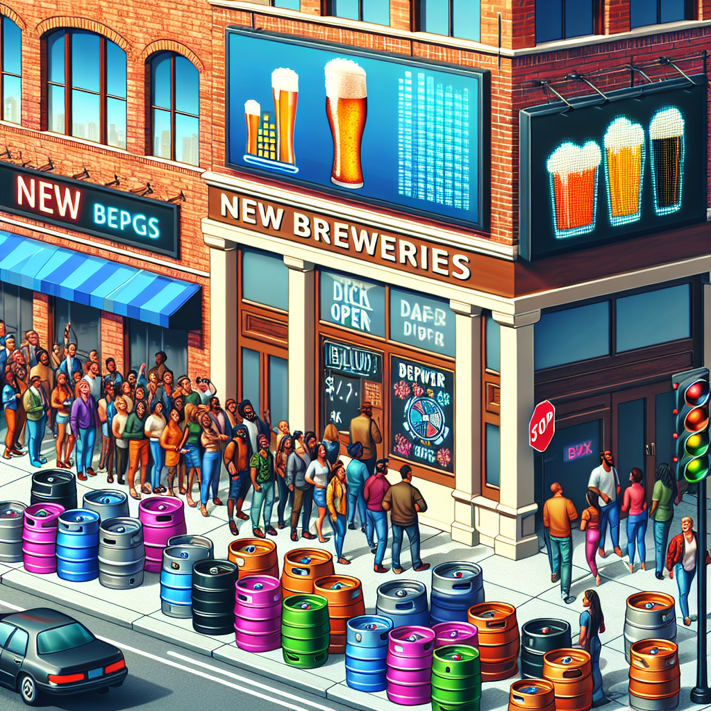 Prompt: Generate a photo-realistic image where a vibrant city street is lined with newly opened breweries, showcasing their stack of colorful and diverse kegs outside their doors. Capture the excitement of the people lined up outside the breweries, eagerly anticipating the chance to sample craft beers. Additionally, include an electronic billboard displaying eBay Inc.'s rising stock price, signaling the surge in demand for kegs. Ensure that the image reflects the bustling and lively energy of the city scene. The depiction should include only scenes, people, and objects, it should not include text or speech bubbles.
