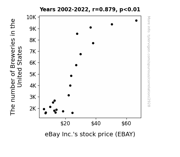 The statistical analysis revealed a robust correlation between the number of breweries in the United States and eBay Inc.'s stock price from 2002 to 2022. The correlation coefficient of 0.8786200 indicated a strong positive relationship between these seemingly disparate variables. To put it simply, as the number of breweries increased, so did eBay Inc.'s stock price, much like the simultaneous rise of bubbles in a fizzy drink.