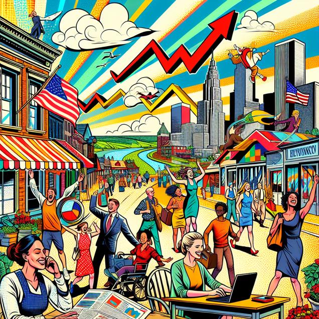 Prompt: Generate an image of Vineland, New Jersey with a vibrant pop art twist, capturing the town's revitalization. Show residents joyfully engaging in daily activities with a backdrop of clear skies and a refreshing breeze. In the foreground, depict the Warner Bros. Discovery headquarters bustling with animated employees collaborating enthusiastically. A dynamic stock market ticker should prominently display the upward trend of WBD stock. Use bold, contrasting colors to convey the energy and positivity within the scene. The depiction should include only scenes, people, and objects, it should not include text or speech bubbles.