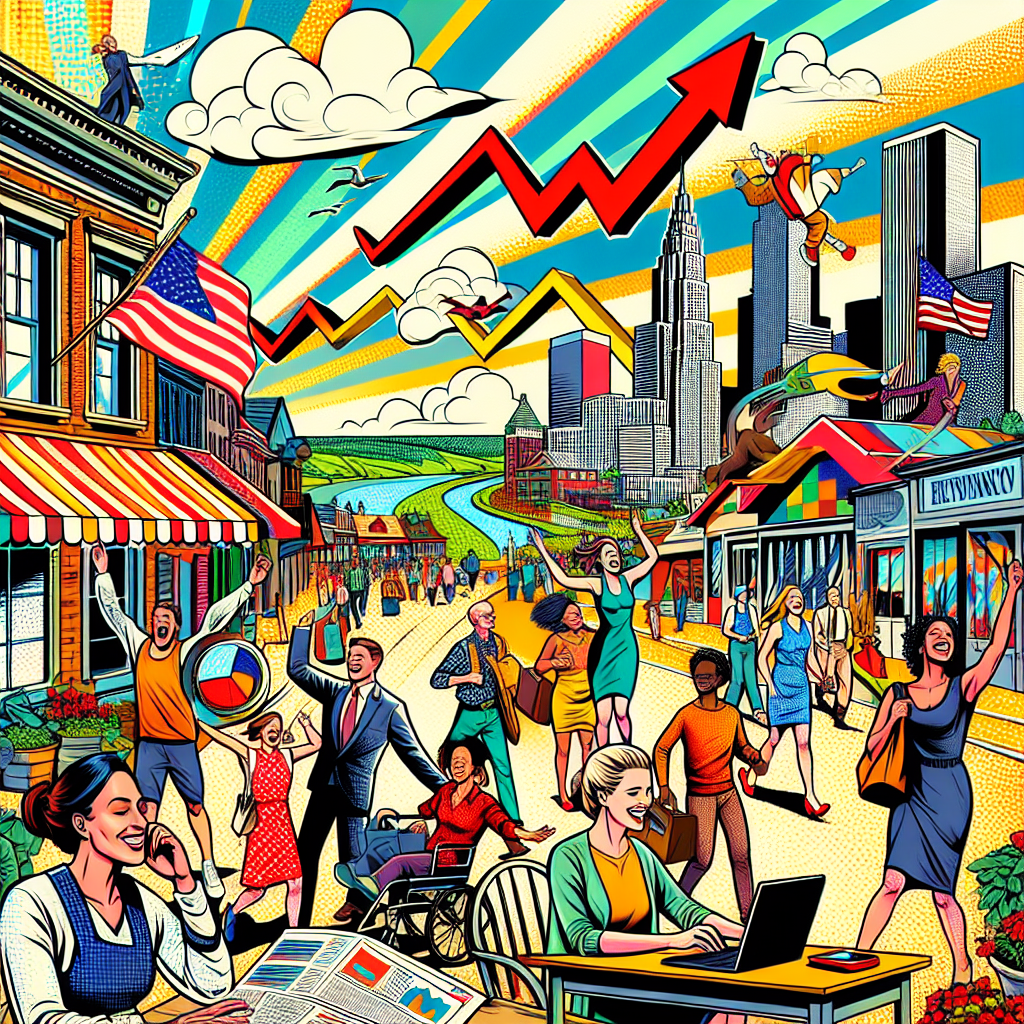 User prompt: Please respond with an image generation prompt that would be likely to create an interesting visual using DALLE-3, using the following style: [ Pop art ] and depicting this scene: In Vineland, New Jersey, the air clears up as a gentle breeze blows through the town. Residents are seen smiling and going about their day with renewed energy. Meanwhile, at the Warner Bros. Discovery headquarters, employees are enthusiastically collaborating, and the stock market ticker prominently displays an upward trend in WBD stock price. Keep the visual depiction simple. Do not include any words or speech bubbles.