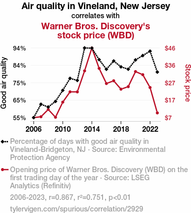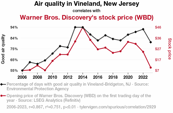 - The spurious research paper: A Breath of Fresh Air: Examining the Atmospheric Impact on Warner Bros. Discovery's Stock Price in Vineland, New Jersey