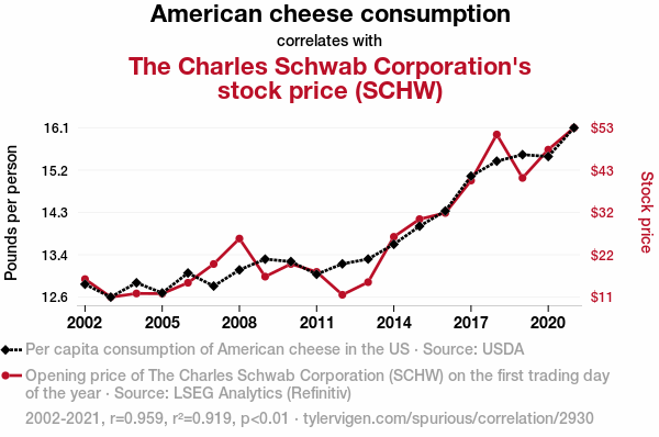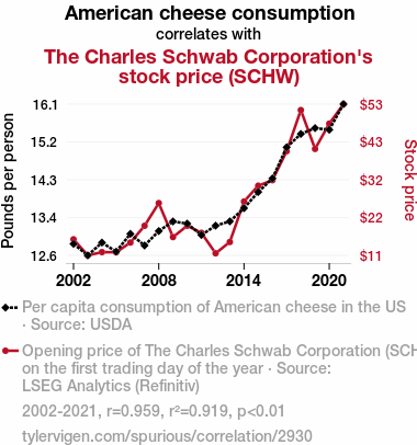 - The spurious research paper: The Cheddar Connection: American Cheese Consumption and Charles Schwab Corporation's Stock Price