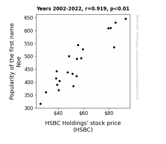 This means 84.5% of the change in the one variable (i.e., HSBC Holdings' stock price (HSBC)) is predictable based on the change in the other (i.e., Popularity of the first name Noe) over the 21 years from 2002 through 2022.