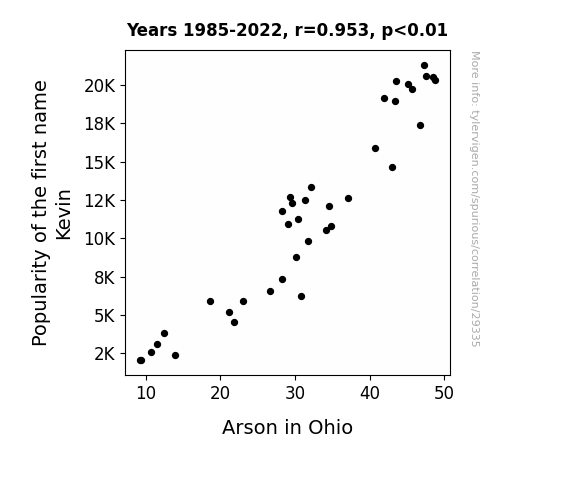 This means 90.9% of the change in the one variable (i.e., Arson in Ohio) is predictable based on the change in the other (i.e., Popularity of the first name Kevin) over the 38 years from 1985 through 2022.