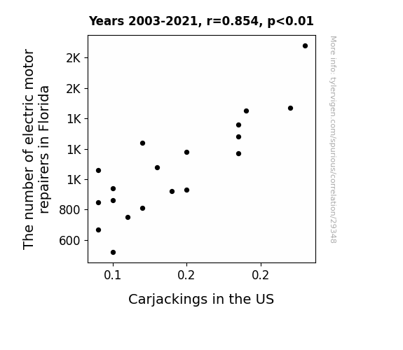 This means 72.9% of the change in the one variable (i.e., Carjackings in the US) is predictable based on the change in the other (i.e., The number of electric motor repairers in Florida) over the 19 years from 2003 through 2021.