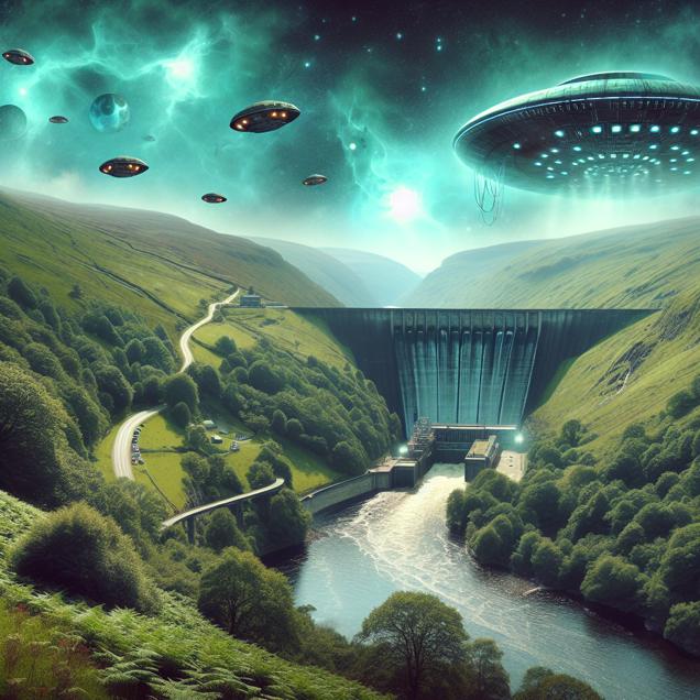 ChatGPT: Create an image that looks like a scene from 'Star Wars', depicting a lush valley in the United Kingdom with a powerful hydroelectric dam standing tall, harnessing the force of the rushing river. The surroundings seem to shimmer with a faint, otherworldly glow. In the background, a group of UFOs hovers over the picturesque landscape, drawn by the unusual changes in the Earth's magnetic field caused by the surge in hydropower. The UFOs appear to be hovering curiously, as if searching for an intergalactic energy source, enticed by the unique energy fluctuations.