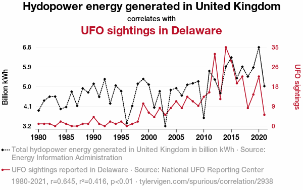 This means 41.6% of the change in the one variable (i.e., UFO sightings in Delaware) is predictable based on the change in the other (i.e., Hydopower energy generated in United Kingdom) over the 42 years from 1980 through 2021.