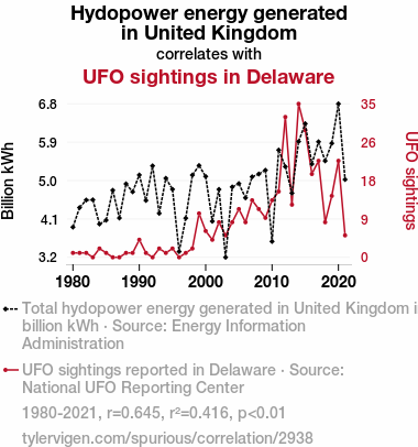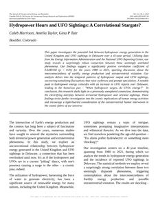 User prompt: Please provide potential search keywords for a paper titled Hydropower Hours and UFO Sightings: A Correlational Stargate? with an abstract of This paper investigates the potential link between hydropower energy generation in the United Kingdom and UFO sightings in Delaware over a 41-year period. Utilizing data from the Energy Information Administration and the National UFO Reporting Center, our study reveals a surprisingly robust connection between these seemingly unrelated phenomena. Our findings suggest a significantly positive correlation coefficient of 0.6449160 (p < 0.01) for the years 1980 to 2021, sparking discussion about the interconnectedness of earthly energy production and extraterrestrial visitation.