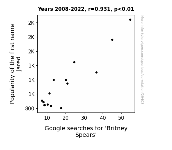 This means 86.8% of the change in the one variable (i.e., Google searches for 'Britney Spears') is predictable based on the change in the other (i.e., Popularity of the first name Jared) over the 15 years from 2008 through 2022.