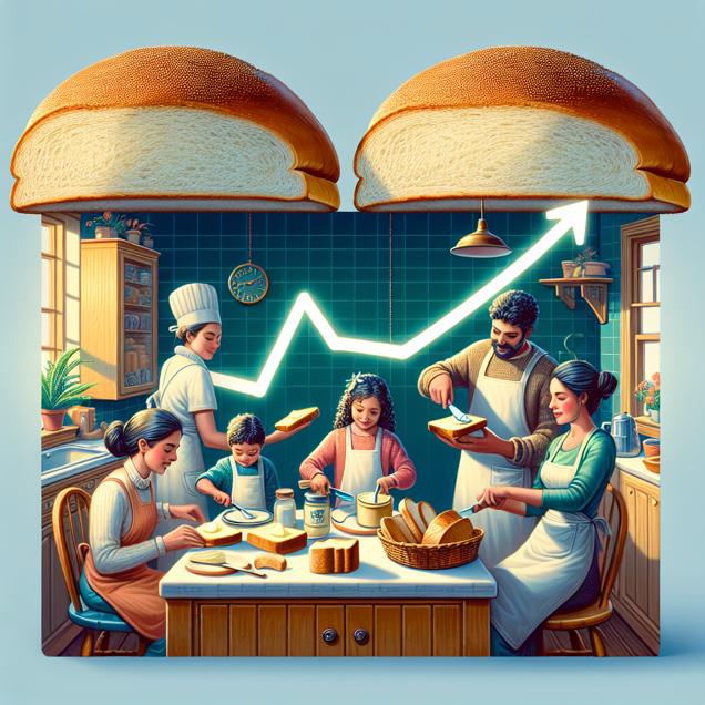 ChatGPT: In a cozy kitchen setting, people are seen spreading generous amounts of butter on slices of toast. In the background, the Dollar Tree's stock price chart is shown with an upward trend, signifying the surge in popularity for their affordable bread offerings due to the increased demand for toast.