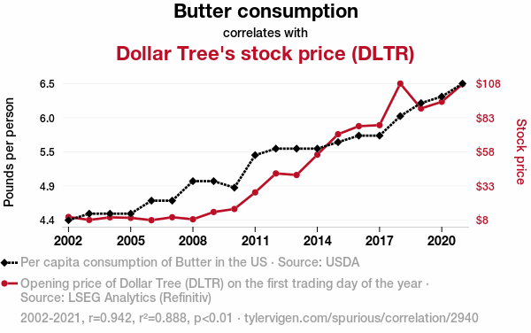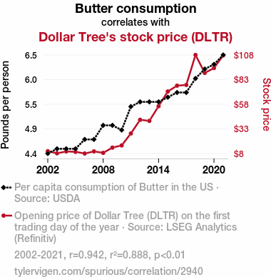 - The spurious research paper: Spreading the Bread: The Mellow Drama of Butter Consumption and Dollar Tree’s Stock Price