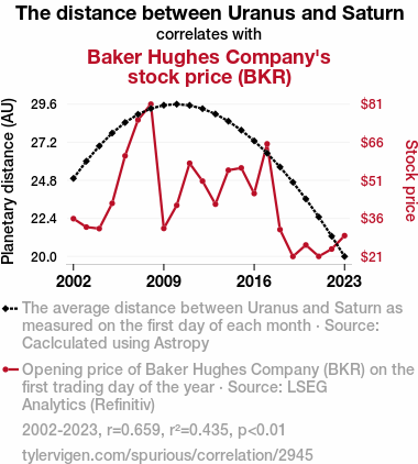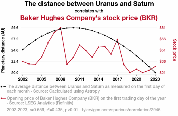 This means 43.5% of the change in the one variable (i.e., Baker Hughes Company's stock price (BKR)) is predictable based on the change in the other (i.e., The distance between Uranus and Saturn) over the 22 years from 2002 through 2023.