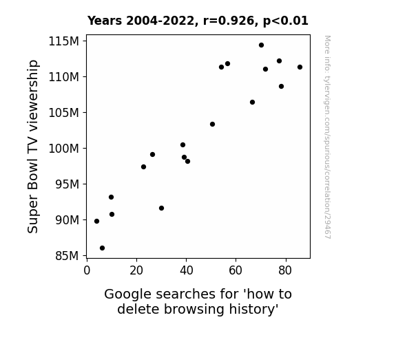This means 85.7% of the change in the one variable (i.e., Google searches for 'how to delete browsing history') is predictable based on the change in the other (i.e., Super Bowl TV viewership) over the 19 years from 2004 through 2022.