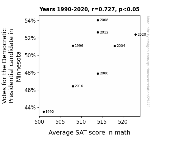 This means 52.8% of the change in the one variable (i.e., Average SAT score in math) is predictable based on the change in the other (i.e., Votes for the Democratic Presidential candidate in Minnesota) over the 8 years from 1990 through 2020.
