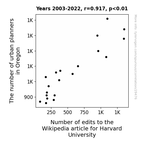 This means 84.1% of the change in the one variable (i.e., Number of edits to the Wikipedia article for Harvard University) is predictable based on the change in the other (i.e., The number of urban planners in Oregon) over the 20 years from 2003 through 2022.