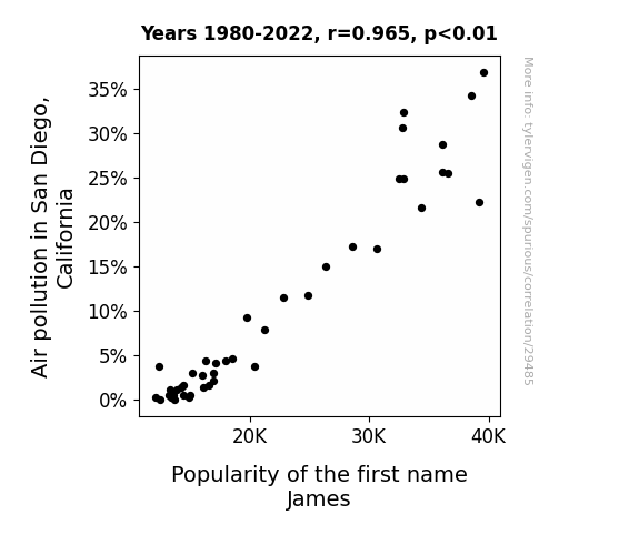 This means 93.2% of the change in the one variable (i.e., Popularity of the first name James) is predictable based on the change in the other (i.e., Air pollution in San Diego, California) over the 43 years from 1980 through 2022.