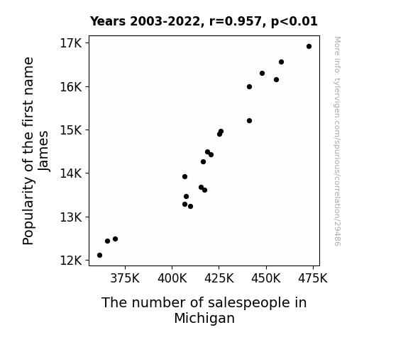This means 91.6% of the change in the one variable (i.e., The number of salespeople in Michigan) is predictable based on the change in the other (i.e., Popularity of the first name James) over the 20 years from 2003 through 2022.
