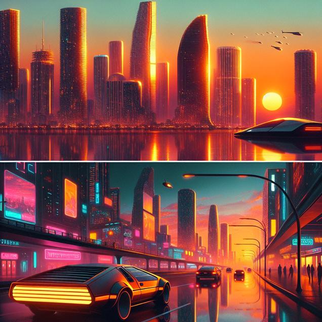 Prompt: Generate an image of a cyberpunk cityscape where Miami is illuminated by a warm orange glow from the sunset. The city is depicted with futuristic skyscrapers, sleek hover cars, and neon signs reflecting off of pristine, clear streets. Contrast this with a desolate scene elsewhere in the United States, where unlit matches lay untouched, symbolizing a significant decrease in arson incidents. The juxtaposition highlights the rebirth of Miami as a beacon of minimalistic, futuristic urban regeneration. The depiction should include only scenes, people, and objects, it should not include text or speech bubbles.