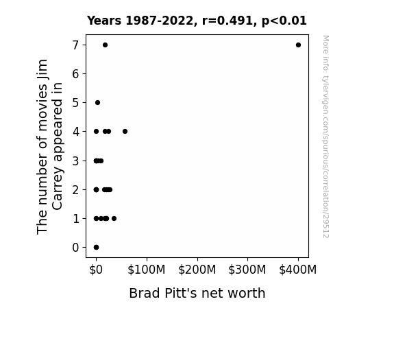This means 24.1% of the change in the one variable (i.e., Brad Pitt's net worth) is predictable based on the change in the other (i.e., The number of movies Jim Carrey appeared in) over the 36 years from 1987 through 2022.