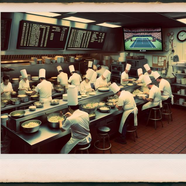 Prompt: Style: [ a Polaroid photo ] Scene: A bustling kitchen in Alaska where chefs and head cooks are meticulously crafting their culinary masterpieces, with a large screen proudly displaying the number "31" to symbolize Roger Federer's 31 Grand Slam Finals. Enhanced prompt: Generate an image capturing a bustling kitchen in Alaska, blending the elegance of cooking with the precision of tennis. Imagine a group of chefs and head cooks immersed in their craft, each carefully perfecting their culinary creations. Amidst the organized chaos, a vintage Polaroid photo depicts the scene, evoking a sense of nostalgia and artistry. The kitchen exudes an atmosphere of passion and dedication, with the large screen in the corner proudly displaying the number "31," in homage to the 31 Grand Slam Finals played by Roger Federer. The chefs draw inspiration from Federer's legendary backhand, infusing their dishes with finesse and skill reminiscent of the tennis icon's graceful precision. The depiction should include only scenes, people, and objects, it should not include text or speech bubbles.