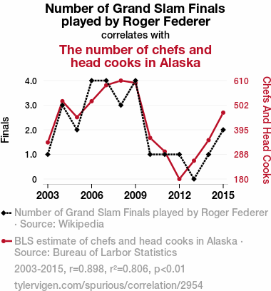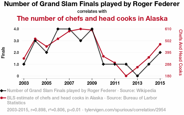 Roger Federer, Alaska, culinary arts, professional tennis, Grand Slam finals, employment, chefs, head cooks, correlation coefficient, statistical significance, Bureau of Labor Statistics, Wikipedia, tennis impact on culinary industry