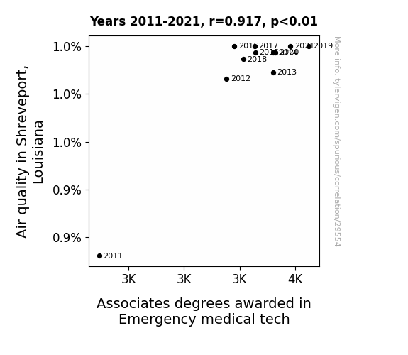 This means 84.1% of the change in the one variable (i.e., Associates degrees awarded in Emergency medical tech) is predictable based on the change in the other (i.e., Air quality in Shreveport, Louisiana) over the 11 years from 2011 through 2021.