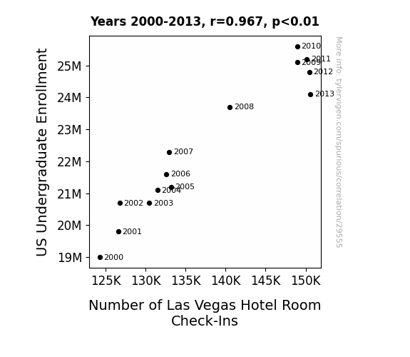 This means 93.6% of the change in the one variable (i.e., Number of Las Vegas Hotel Room Check-Ins) is predictable based on the change in the other (i.e., US Undergraduate Enrollment) over the 14 years from 2000 through 2013.