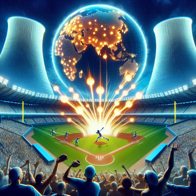 Prompt: Certainly! Here's a refined image generation prompt for DALL-E 3: Visual Prompt: Generate an image that features a world map with an array of glowing dots to symbolize nuclear power plants scattered across the globe. Superimposed over this map is the striking baseball diamond of the Atlanta Braves stadium. Within the stadium, enthusiastic fans are cheering, and baseballs are soaring high into the air. The baseball players are depicted as being supercharged, hitting exhilarating home runs as if powered by an unseen force. An electric energy surges through the players, drawing in crowds eager to witness the remarkable power surge on the field. The scene should be depicted with a focus on the electric energy flowing through the players and the powerful, dynamic nature of the event. The colors should be vibrant and energetic, capturing the excitement and energy of the scene. The depiction should include only scenes, people, and objects, it should not include text or speech bubbles.