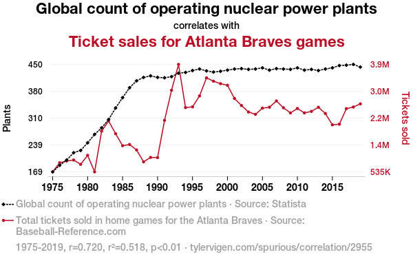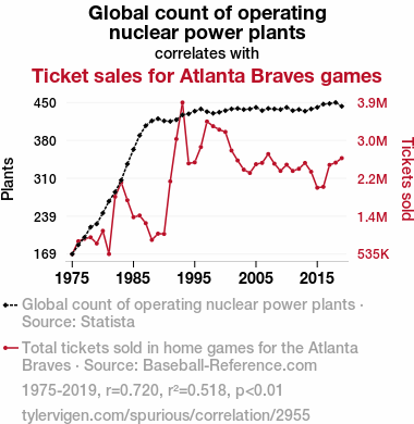 A linear line chart with years as the X-axis and two variables on the Y-axis. The first variable is Global count of operating nuclear power plants and the second variable is Ticket sales for Atlanta Braves games.  The chart goes from 1975 to 2019, and the two variables track closely in value over that time. Small Image