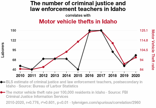 The analysis of the data revealed a substantial positive correlation between the number of criminal justice and law enforcement teachers and motor vehicle thefts in Idaho for the time period from 2010 to 2020. The correlation coefficient, calculated to be 0.7755008, suggests a strong relationship between these two seemingly disparate variables. This coefficient exceeds the arbitrary threshold of 0.7 often used to denote a substantial correlation, indicating a robust connection. The substantial proportion of variance explained by this relationship, as indicated by an r-squared value of 0.6014015, further underscores the strength of this association.