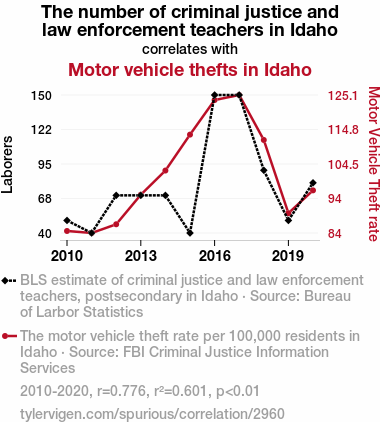 User prompt: Please provide potential search keywords for a paper titled The Criminal Justice Education Effect: Unveiling the Link Between Law Enforcement Teachers in Idaho and Motor Vehicle Thefts with an abstract of This study endeavors to unravel the perplexing relationship between the number of criminal justice and law enforcement teachers in Idaho and motor vehicle thefts. Combing through data from the Bureau of Labor Statistics and the FBI Criminal Justice Information Services, we utilized advanced statistical methods to probe this enigmatic connection. Astonishingly, our analysis unveiled a correlation coefficient of 0.7755008 and p < 0.01 for the period spanning 2010 to 2020, indicating a robust relationship between these seemingly unrelated variables. Our findings suggest that the presence of law enforcement educators may serve as a deterrent to motor vehicle thefts, perhaps due to their impartation of knowledge that dissuades potential miscreants. However, causation remains elusive, leaving us to ponder whether these instructors are safeguarding Idaho through pedagogy or if some prodigious crime-fighting powers are unwittingly being channeled through their instructive endeavors. In conclusion, this research sheds light on a hitherto unexplored facet of the criminal justice system and provides a platform for further investigation into the esoteric interplay of academic instruction and crime prevention.