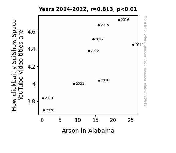 This means 66.1% of the change in the one variable (i.e., Arson in Alabama) is predictable based on the change in the other (i.e., How clickbait-y SciShow Space YouTube video titles are) over the 9 years from 2014 through 2022.