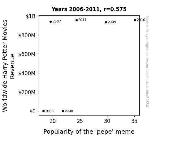 This means 33% of the change in the one variable (i.e., Popularity of the 'pepe' meme) is predictable based on the change in the other (i.e., Worldwide Harry Potter Movies Revenue) over the 6 years from 2006 through 2011.