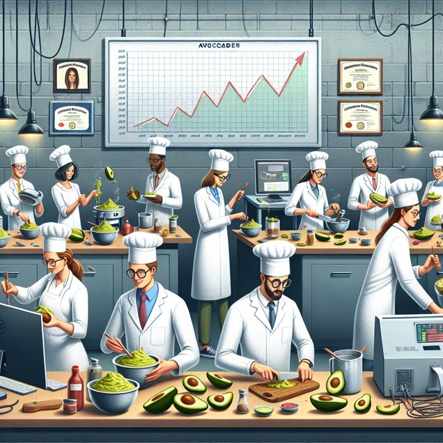 Prompt: Generate an image of a meme that humorously illustrates the scenario of graduates in Science technologies and technicians working in a bustling kitchen laboratory. They are expertly slicing and mashing avocados, while carefully measuring precise amounts of ingredients. Their Associates degrees are proudly displayed on the wall. Nearby, a computer screen displays a spike in Google searches for "avocado toast", indicating the growing curiosity about this trendy snack. The convergence of scientific expertise and culinary delight is evident as the room fills with the delightful aroma of perfectly crafted avocado toast. The depiction should include only scenes, people, and objects, it should not include text or speech bubbles.