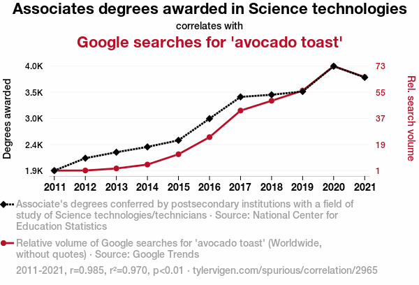 User prompt: Please make up a funny explanation for how an increase in Associates degrees awarded in Science technologies/technicians caused avocado toast (Google searches for 'avocado toast') to increase. Add a funny one-liner at the end.
