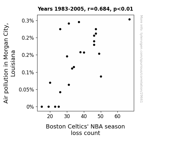 This means 46.8% of the change in the one variable (i.e., Boston Celtics' NBA season loss count) is predictable based on the change in the other (i.e., Air pollution in Morgan City, Louisiana) over the 23 years from 1983 through 2005.