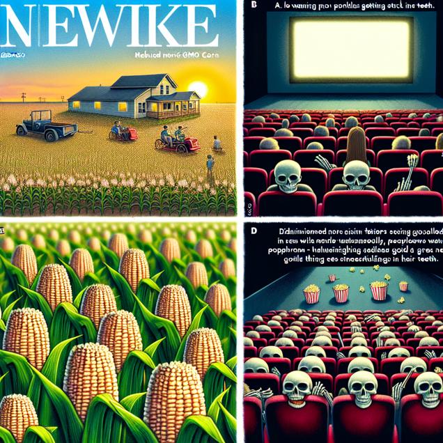 ChatGPT: A cornfield in Nebraska stands with non-GMO corn plants, which are smaller in size and yield. Movie theaters around the world display empty popcorn buckets while people watch movies, resulting in fewer kernels getting stuck in teeth. As a result, there's a decline in dental visits and less gold teeth being extracted. Pirates stand on an empty ship, frustrated as their loot decreases.