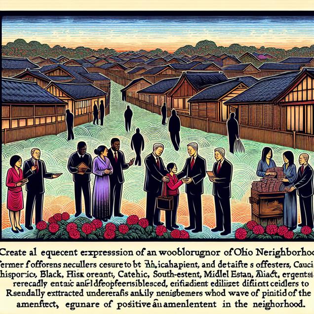 ChatGPT: Generate an image of a serene Ohio neighborhood, with traditional woodblock painting aesthetics. Depict former burglars, now neatly dressed in business attire, offering empathetic support to individuals in debt. Show the transformation of these individuals from criminals to understanding community members, with a peaceful atmosphere and a sense of positive change in the neighborhood.