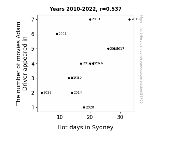 This means 28.9% of the change in the one variable (i.e., Hot days in Sydney) is predictable based on the change in the other (i.e., The number of movies Adam Driver appeared in) over the 13 years from 2010 through 2022.