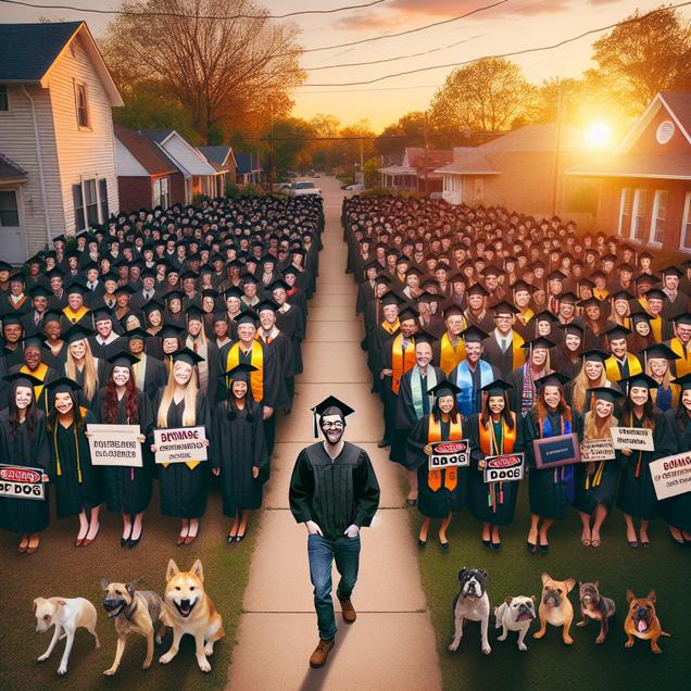 ChatGPT: [ Symbolism ] Generate an image of a tranquil Arkansas town showcasing a university graduation ceremony. The scene includes a group of proud students in graduation caps and gowns receiving their Bachelor's degrees in Foreign languages, literatures, and linguistics. As the evening sets in, the warm light highlights a row of peaceful residential houses. Within this idyllic setting, a would-be burglar is seen sneaking past when he suddenly pauses, confronted by multilingual "Beware of Dog" signs in English, Spanish, French, and German adorning each house. The image should capture the confusion and stoppage of the burglar due to the lack of understanding the warnings in multiple languages, symbolizing the decrease in burglaries brought about by the community's multilingualism.