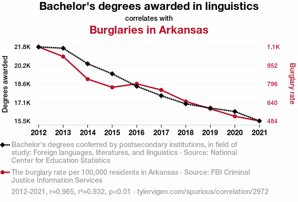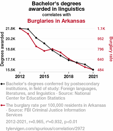 - The spurious research paper: Lost in Translation: Unraveling the Link Between Foreign Language Degrees and Burglaries in Arkansas