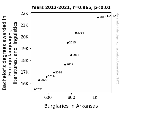 User prompt: Please provide potential search keywords for a paper titled Lost in Translation: Unraveling the Link Between Foreign Language Degrees and Burglaries in Arkansas with an abstract of This study sought to decipher the mysterious connection between the awarding of bachelor's degrees in foreign languages, literatures, and linguistics and the occurrence of burglaries in the state of Arkansas. Using data from the National Center for Education Statistics and the FBI Criminal Justice Information Services, we delved into the intricacies of this unexpected relationship. Our findings revealed a surprising correlation coefficient of 0.9654299 and a p-value of less than 0.01 from 2012 to 2021, suggesting a strong and statistically significant association. Our research presents whimsical yet thought-provoking insights into the curious interplay between linguistic prowess and criminal activities, shedding light on a hitherto overlooked aspect of social dynamics.