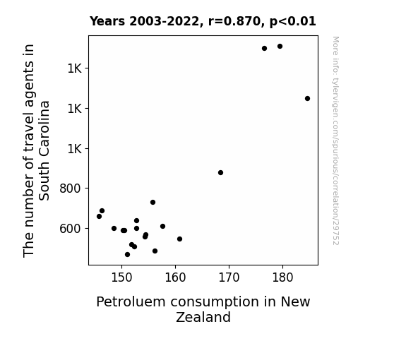 This means 75.6% of the change in the one variable (i.e., Petroluem consumption in New Zealand) is predictable based on the change in the other (i.e., The number of travel agents in South Carolina) over the 20 years from 2003 through 2022.