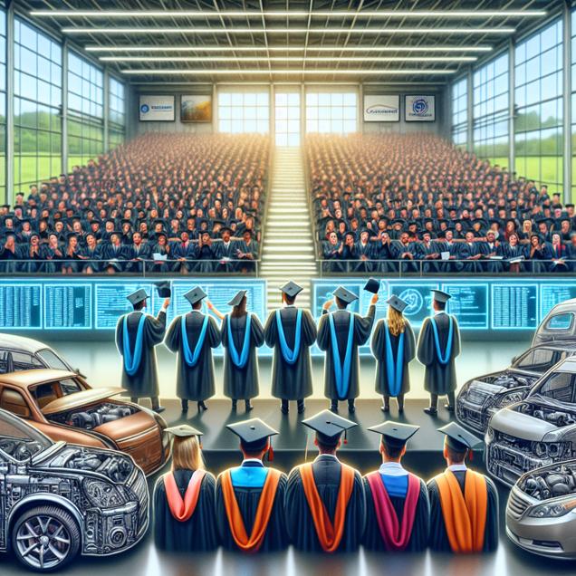 ChatGPT: Using the style of [Photorealism], generate an image of a well-lit lecture hall, where a group of engineers stand proudly, receiving their Master's degrees in Engineering. The engineers should be depicted as confident and knowledgeable, showcasing their expertise in designing complex systems. In the background, depict a line of vehicles awaiting inspection for an automotive recall related to air bag issues. The engineers' pride and confidence contrast with the potential issues highlighted by the increased number of vehicle recalls, emphasizing the importance of thorough testing and safety in engineering.